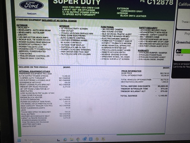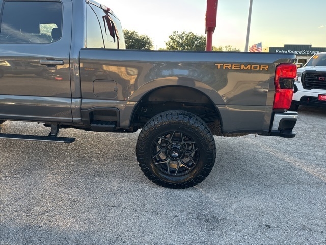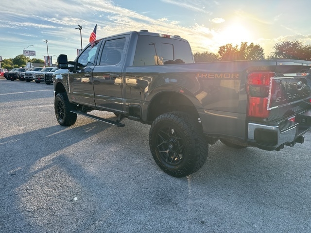 , *Tremor*, 4WD, 20K 5th Wheel Hitch Kit (Pre-Installed), 4-Way Adjustable Headrests, 4-Wheel Disc Brakes, 5th Wheel/Gooseneck Hitch Prep Package, ABS brakes, Air Conditioning, Automatic temperature control, Brake assist, Compass, Dual front impact airbags, Dual front side impact airbags, Electronic Stability Control, Electronic-Locking w/3.55 Axle Ratio, Emergency communication system: SYNC 4 911 Assist, Engine Block Heater, Exterior Parking Camera Rear, F-250 >10K GVWR Package, Front anti-roll bar, Front Sensing System, Fully automatic headlights, Gooseneck Hitch Kit (Pre-Installed), Head-Up Display, Heated door mirrors, Heated front seats, Intelligent Adaptive Cruise Control w/Stop-and-Go, Lane Departure Warning System, Lane Keeping Assist, Lariat Ultimate Package, Low tire pressure warning, Navigation system: Connected Navigation, Overhead airbag, Power door mirrors, Power steering, Power windows, Power-Deployable Running Boards, Pre-Collision Assist, Pro Trailer Backup Assist, Pro Trailer Hitch Assist, Radio: B&O Unleashed Sound System by Bang & Olufsen, Rear step bumper, Remote keyless entry, SiriusXM Radio w/360L, Speed control, Split folding rear seat, Steering wheel mounted audio controls, SYNC 4 w/Enhanced Voice Recognition, Tachometer, Tailgate Step & Handle, Telescoping steering wheel, Textured Matte Finish Off-Road Running Boards, Tilt steering wheel, Tough Bed Spray-In Bedliner, Tow Technology Package, Traction control, Tremor Off-Road Package, Trip computer, Turn signal indicator mirrors, Twin Panel Power Moonroof, Upfitter Switches (6), Variably intermittent wipers, Ventilated front seats, Wireless Charging Pad.